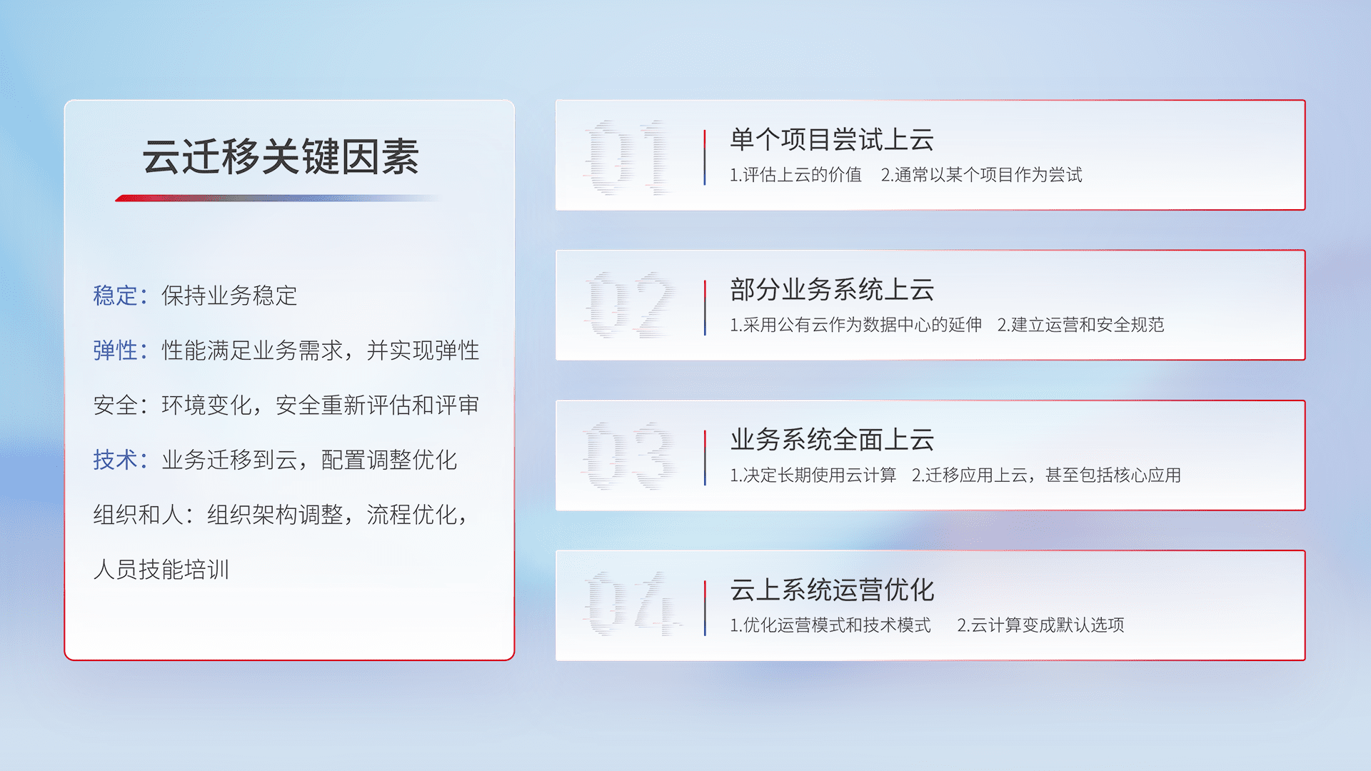 结合实际业务,,从规划设计、、云平台选型、、云原生改造、、数据迁移、、、、集成交付,,,迁移全过程为客户识别最佳上云路径,,,,做好风险识别管理,,设计网络架构、、、、身份权限、、、、安全审计合规、、、操作审计、、日志审计、、监控告警策略、、、、多站点容灾设计等,,对云上基础设施进行整体规划,,,提升IT治理水平,,,,以满足弹性、、、、高可用、、、、高性能的需求。。
