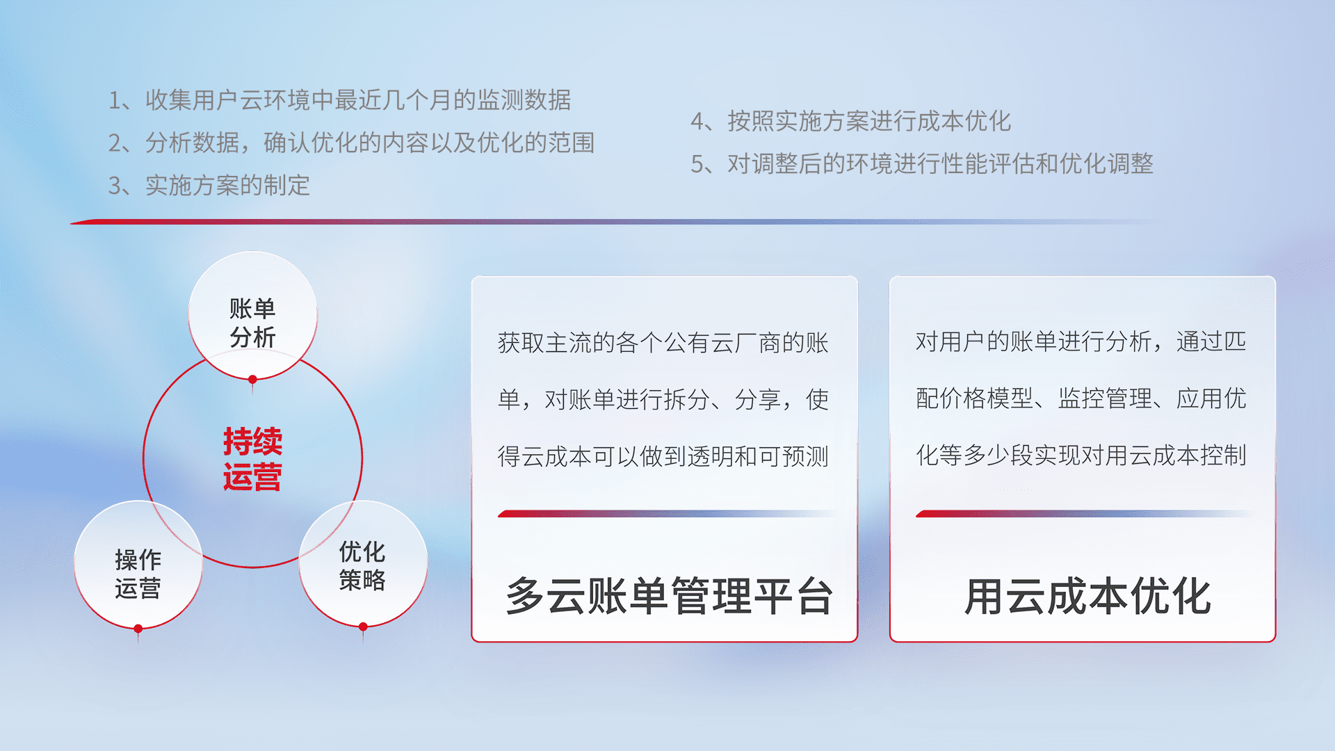 通过多云纳管,,,以统一的资源数据模型把客户的云资源进行抽象和封装,,,进而实现对多云资源的统一操作,,,,保障云资源管理的可靠性、、稳定性与可用性。。。。量身定制化运维内容,,,配置、、、、开发运维、、、补丁管理、、、备份、、监控、、、、认证和访问管理、、、审计和日常巡检等,,,保障在用云过程中的可靠度,,稳定度以及高可用率。。。