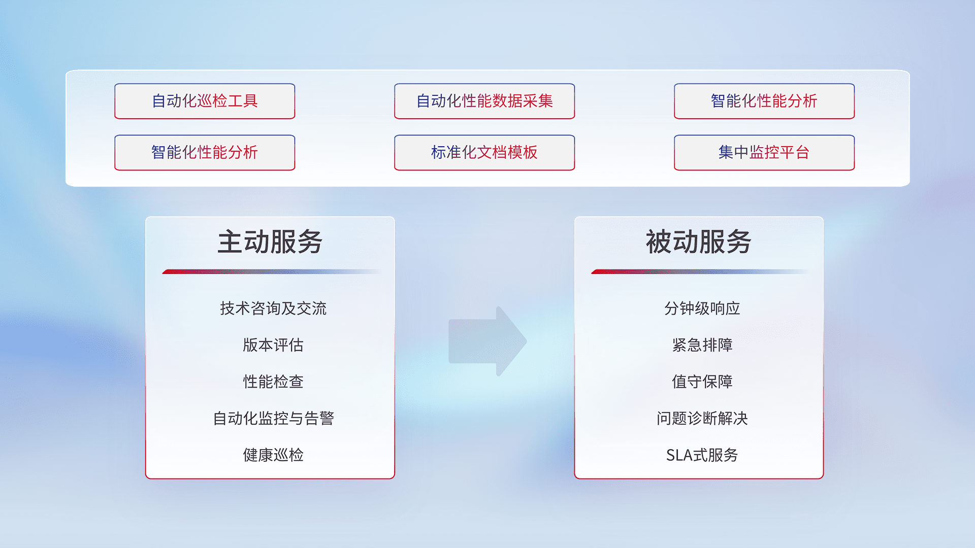 智能化工具和标准化文档,,,保障服务质量,,,,提供主动服务(包含技术咨询、、、版本评估、、性能检查、、、、自动化监控与告警、、、、健康巡检)和被动服务包含(分钟级响应、、紧急排障、、值守保障、、、、问题诊断解决、、SLA服务)。。